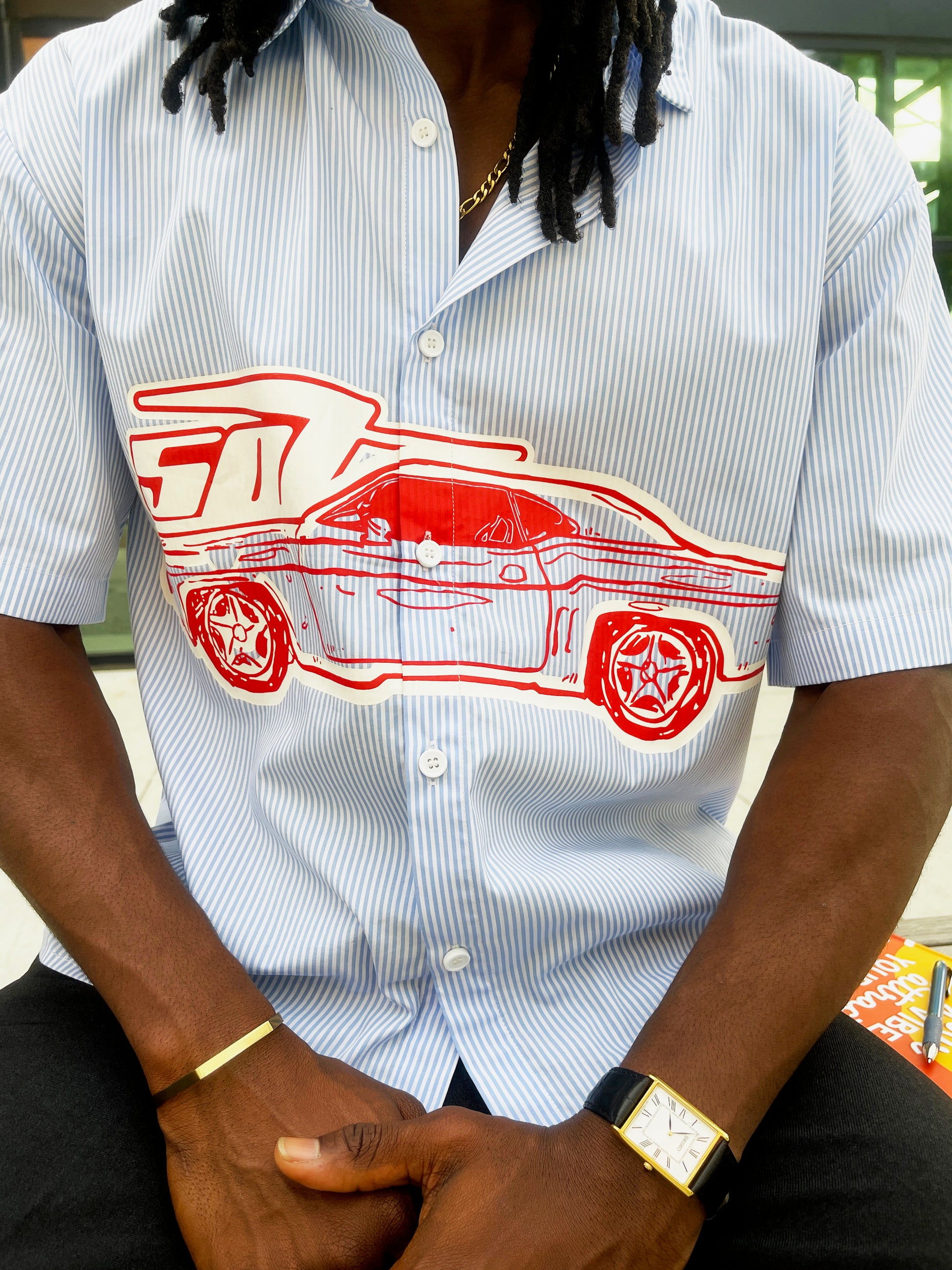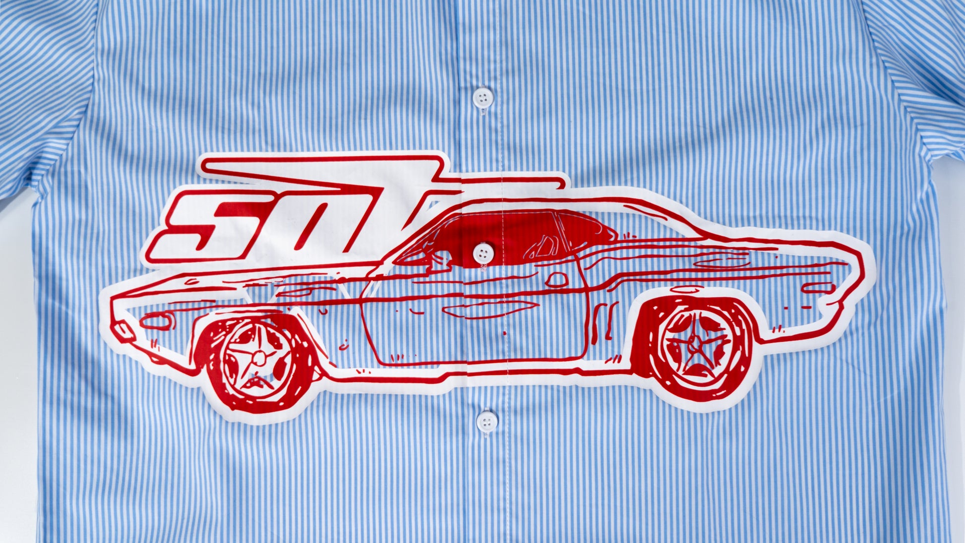 Retro Racer shirt inspired by vintage motorsport with a modern twist. Tailored with the finest materials, this cropped, boxy silhouette redefines classic pinstripes in crisp blue and white.